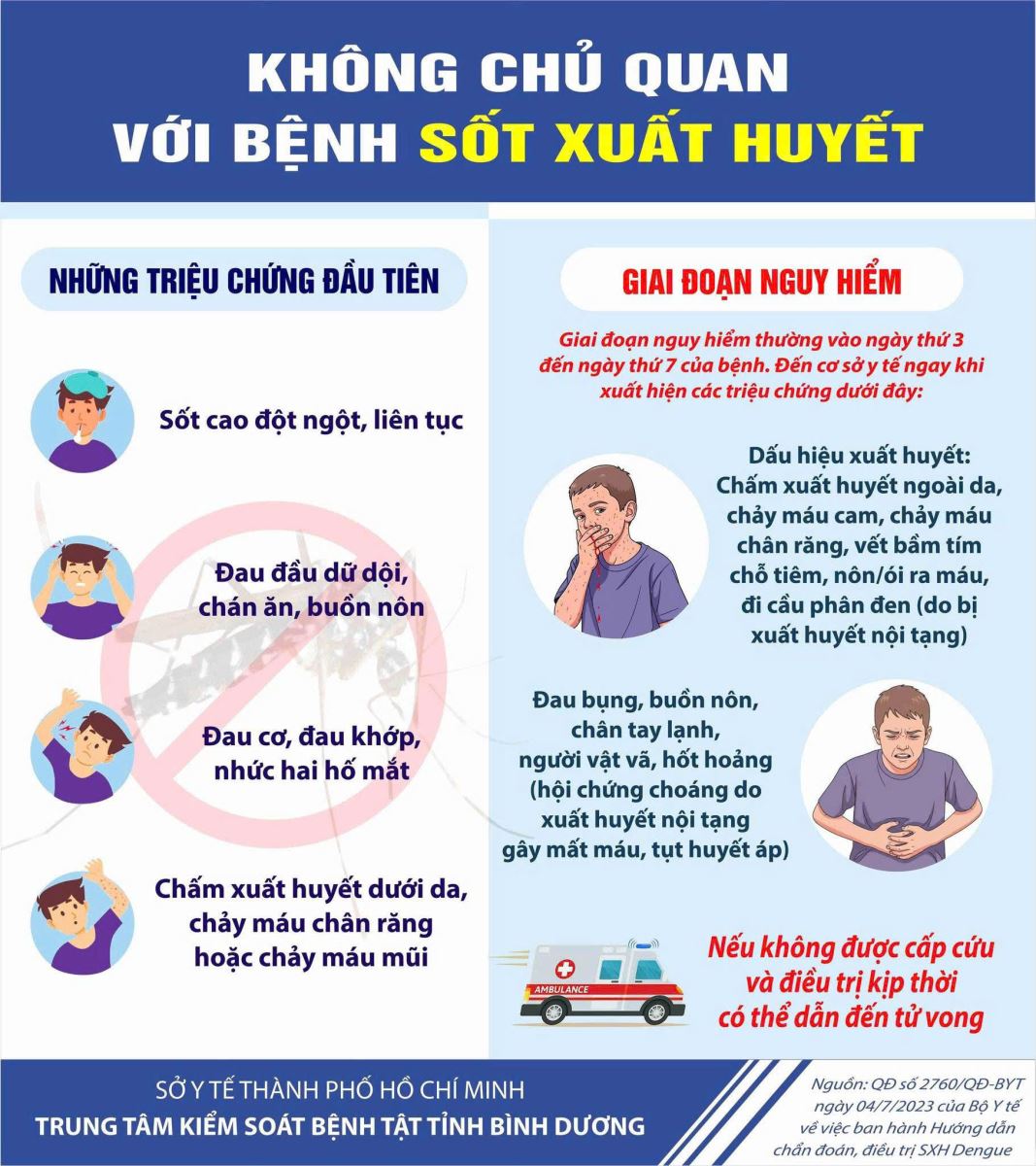 Lượt xem:0 TUYÊN TRUYỀN PHÒNG, CHỐNG BỆNH SỐT XUẤT HUYẾT Chia s? TUYÊN TRUYỀN PHÒNG, CHỐNG BỆNH SỐT XUẤT HUYẾT Sốt xuất huyết là bệnh truyền nhiễm nguy hiểm do vi rút Dengue gây ra, lây truyền từ người sang người qua muỗi vằn đốt. Bệnh có thể xảy ra quanh năm, đặc biệt gia tăng vào mùa mưa, ảnh hưởng nghiêm trọng đến sức khỏe cộng đồng, nhất là trẻ em. Các dấu hiệu thường gặp của bệnh sốt xuất huyết gồm: sốt cao đột ngột, đau đầu, đau hốc mắt, mệt mỏi, đau cơ khớp, buồn nôn; một số trường hợp có thể xuất hiện chấm xuất huyết dưới da, chảy máu mũi, chảy máu chân răng. Khi có các biểu hiện nghi ngờ mắc bệnh, người dân cần nhanh chóng đến cơ sở y tế để được thăm khám và điều trị kịp thời, không tự ý dùng thuốc tại nhà. Hiện nay chưa có thuốc điều trị đặc hiệu cho bệnh sốt xuất huyết, vì vậy công tác phòng bệnh đóng vai trò hết sức quan trọng. Mỗi gia đình và cộng đồng cần chủ động thực hiện các biện pháp như: diệt muỗi, diệt lăng quăng (bọ gậy) bằng cách đậy kín các dụng cụ chứa nước, thường xuyên thay nước bình hoa, thu gom phế thải, lật úp các vật dụng có thể đọng nước; ngủ màn kể cả ban ngày; giữ gìn vệ sinh môi trường sống sạch sẽ, thông thoáng. Phòng, chống sốt xuất huyết là trách nhiệm của toàn xã hội. Mỗi người dân hãy nâng cao ý thức, tích cực tham gia các hoạt động vệ sinh môi trường, diệt muỗi, diệt lăng quăng, góp phần bảo vệ sức khỏe cho bản thân, gia đình và cộng đồng. Chung tay hành động – Vì một môi trường sống an toàn, không có sốt xuất huyết! Tải về Thông tin tài liệu TUYÊN TRUYỀN PHÒNG, CHỐNG BỆNH SỐT XUẤT HUYẾT